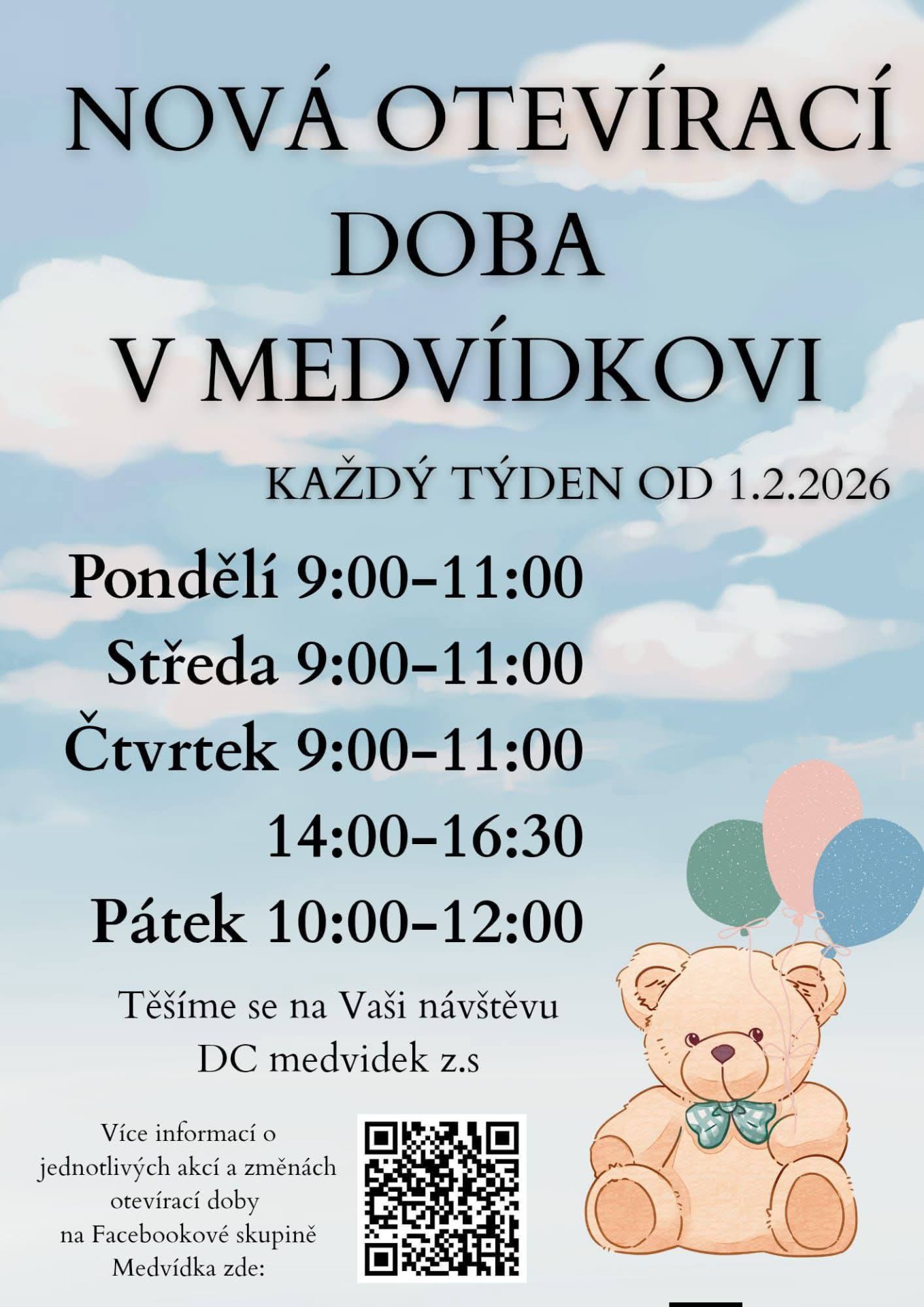 U nás si můžete pohrát, tvořit, pobavit se, najít nové kamarády. Zastavte se u nás dle otevírací doby, která je uvedená na FB Dětská herna Medvídek. Stejně tak tam najdete aktuality o jednotlivých akcích, fotografie a případné změny v otevírací době.